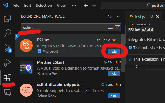 Extensions頁面中搜尋ESLint,並選擇Install -